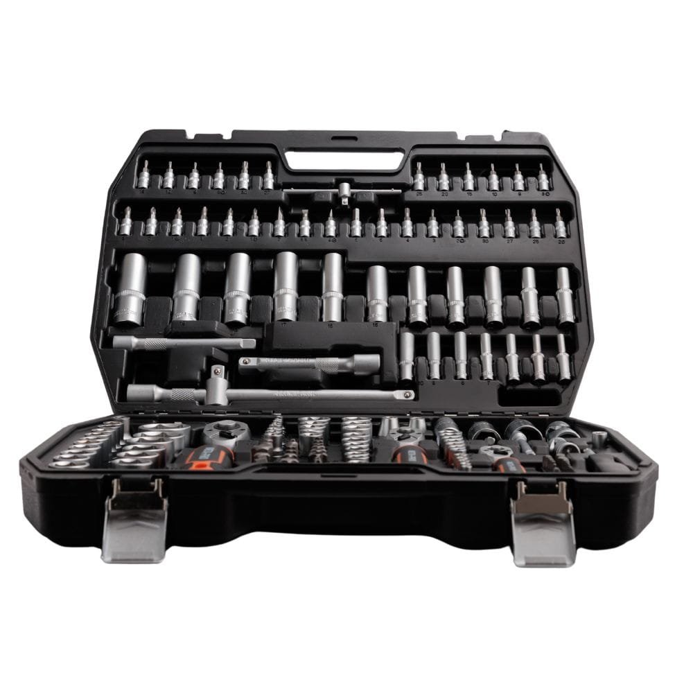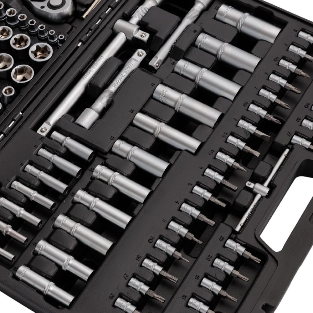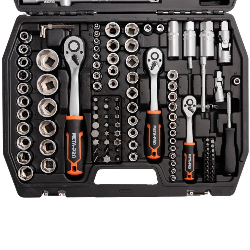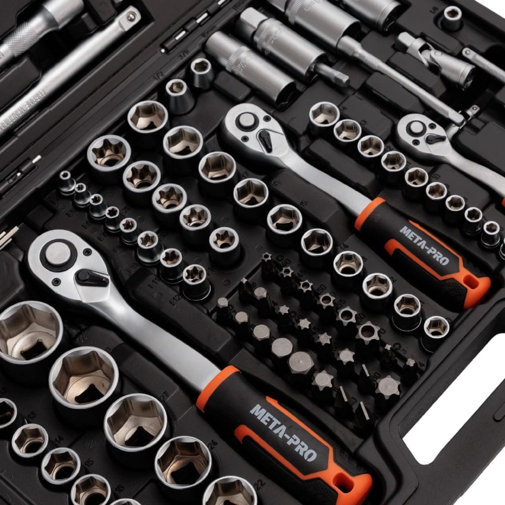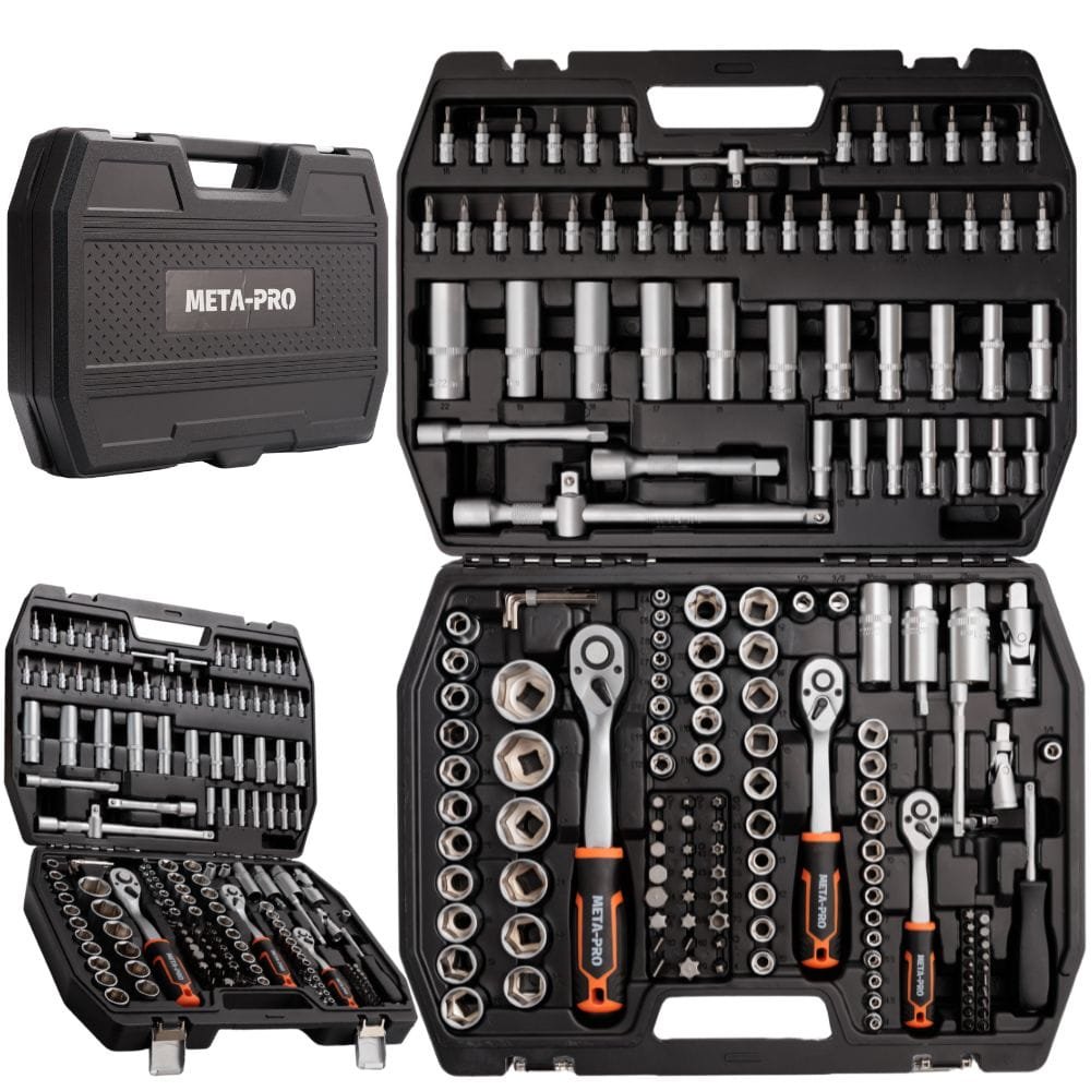 A META-PRO 171 darabos professzionális készlet tartós CR-V acélból készült, biztosítva a tartósságot, a megbízhatóságot és a kényelmet. Különböző behajtóméretekkel (1/4″, 3/8″, 1/2″) és széles dugókulcs-, bit- és tartozékválasztékkal ez a készlet bármilyen feladatot képes elvégezni.