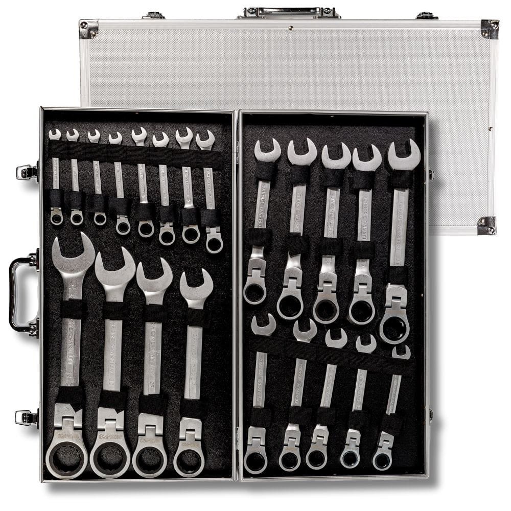 Ez a 22 darabos króm-vanádium (CR-V) acélból készült csuklós villáskulcs-készlet tartósságot, kényelmet és megbízhatóságot garantál. A csuklós végek lehetővé teszik, hogy még a nehezen hozzáférhető helyeket is elérje, míg a széles méretválaszték univerzális használatot biztosít.